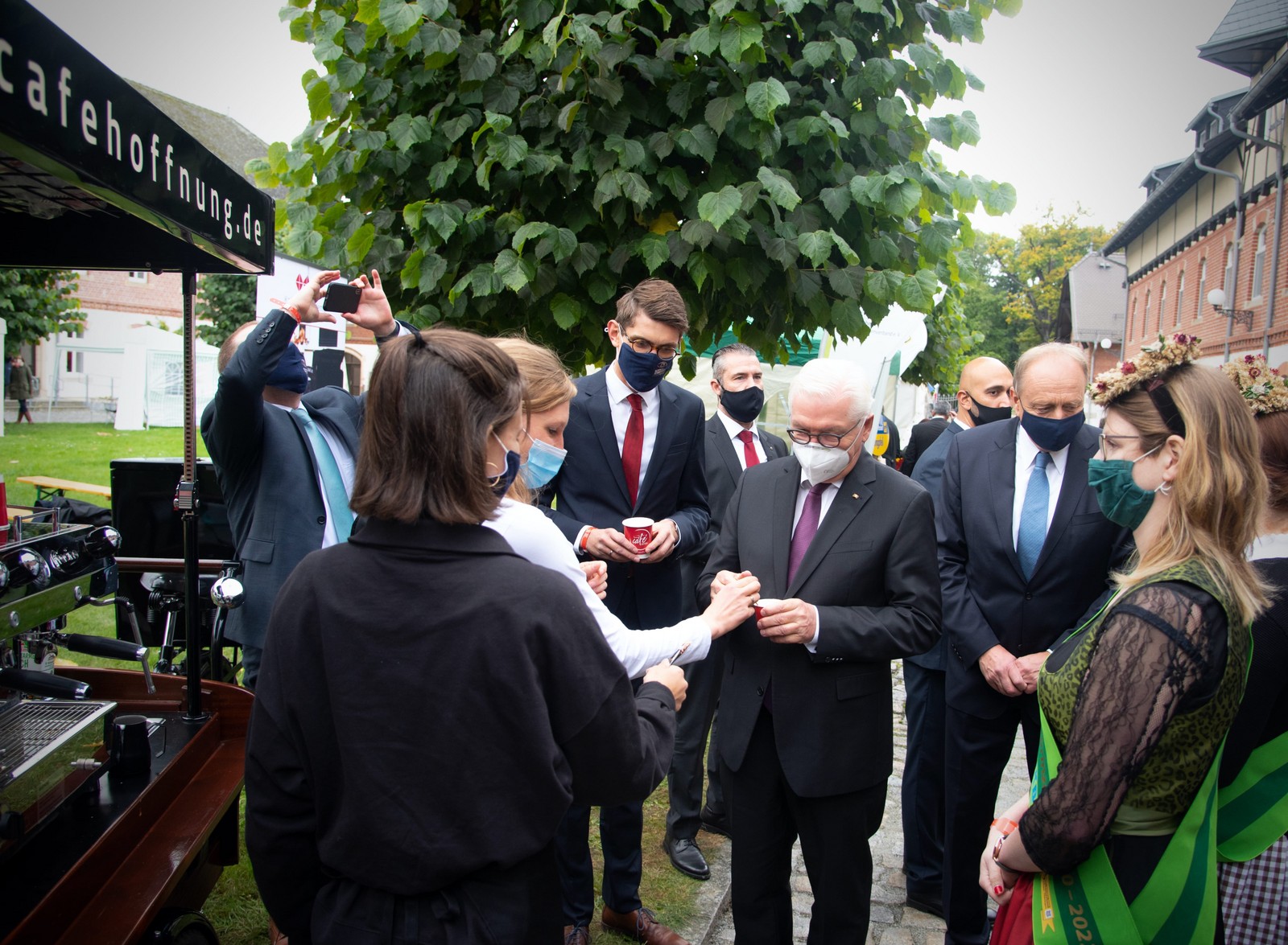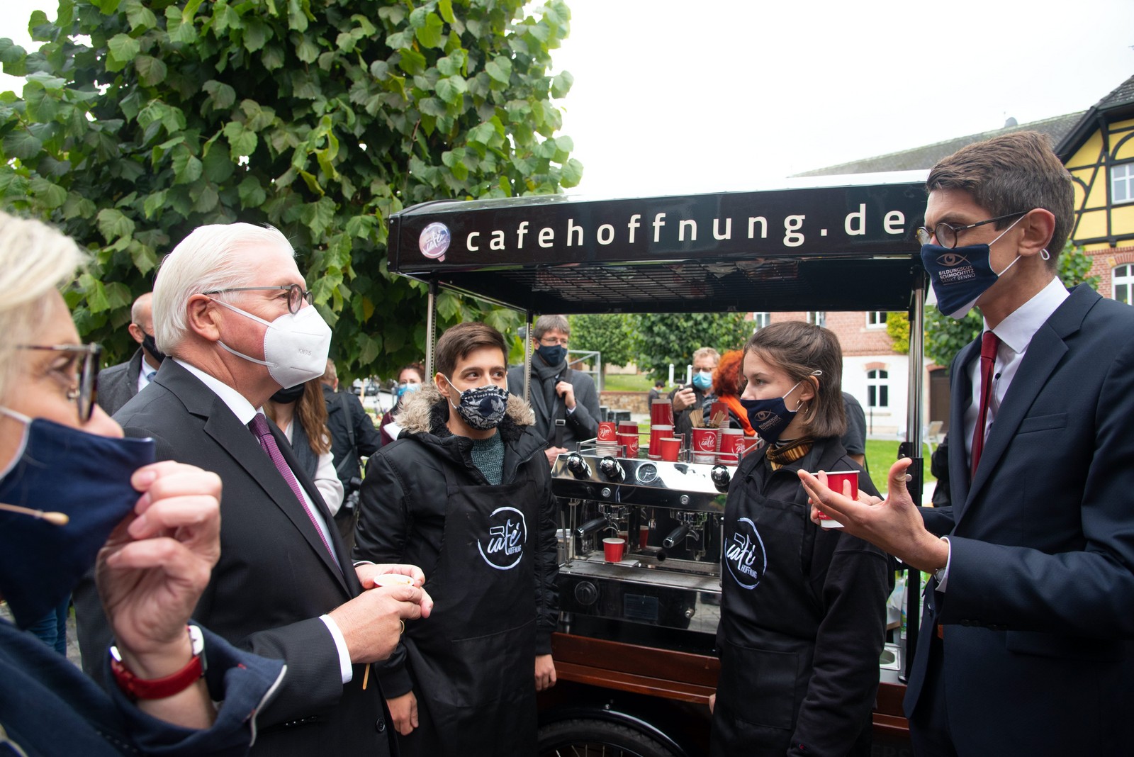 Bautzen. Der unkonventionelle Einsatz des Café Hoffnung im interkulturellen und interreligiösen Bereich erhielt Anerkennung durch den Bundespräsidenten: Bei herbstlichem Sonnenschein war das Café Hoffnung am gestrigen Sonntag bei der Übergabe der Bundeserntekrone an Bundespräsident Frank-Walter Steinmeier im Bildungsgut Schmochtitz vor Ort. Der Bundespräsident nahm sich vor dem live übertragenen Fernsehgottesdienst spontan die Zeit, einen frisch gebrühten Cappuccino zu trinken und sich zum Projekt gemeinsam mit dem sächsischen Ministerpräsidenten, Michael Kretschmer, und dem Bischof von Dresden-Meißen, Heinrich Timmerevers, zu informieren. Der Bundespräsident war vor allem von der Interkulturalität, die das Projekt-Team auszeichnet, angetan. Bischof Heinrich Timmerevers: „Wir kommen durch dieses Projekt explizit im ländlichen Raum mit den Menschen ins Gespräch. Wichtig ist uns, dass Kirche auch dort vor Ort ist, wo andere sich zurückziehen. Das erfordert Kreativität und neue Formen. Wir sind dankbar, dass Kirche und das Land Sachsen sich mit solchen Initiativen gemeinsam für das gesellschaftliche Miteinander einsetzen.“