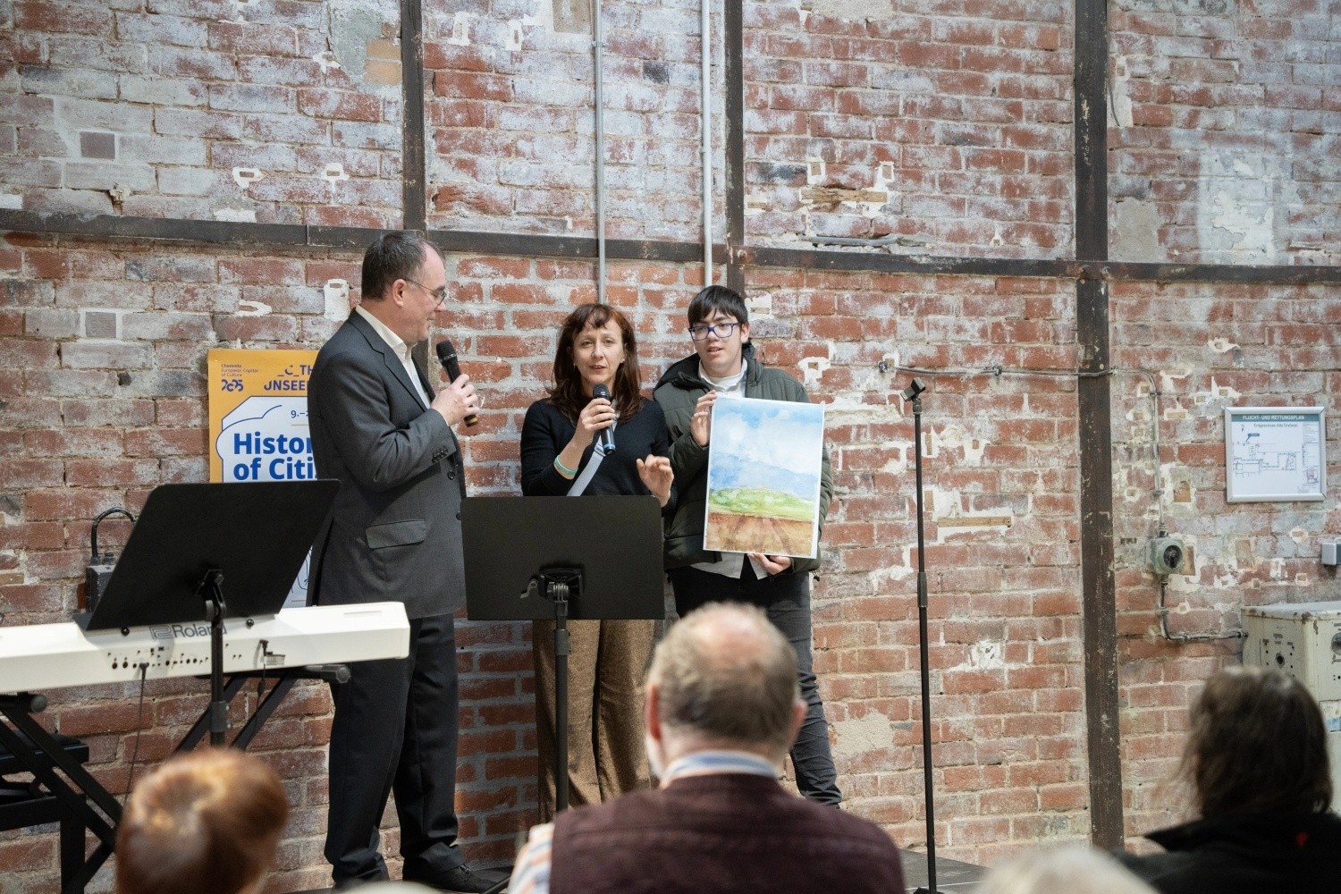 Musikalische Umrahmung bot – passend zum Thema der Ausstellung – das generationsübergreifende Duo Thomas Stöß (Klavier) und Anna Stöß (Flöte). Stephan Schmidte von der Kulturhauptstadt Chemnitz 2025 GmbH, betonte in seinem Grußwort die Bedeutung von History of Citizens als Kooperationsprojekt der Kulturhauptstadt GmbH.