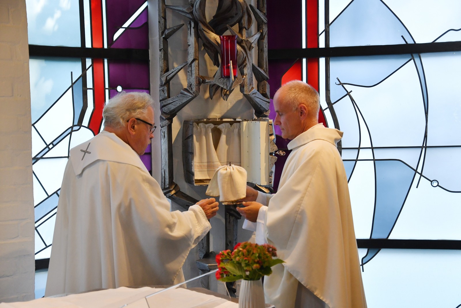 Nach dem Verlesen des Profanierungs-Dekrets entnahm Pfarrer Wolf das Allerheiligste aus dem Tabernakel und die Reliquie aus dem Altar. Gemeinsam mit den Mitfeiernden wurden Kerzen, Blumen und Altartuch aus der Kapelle getragen.