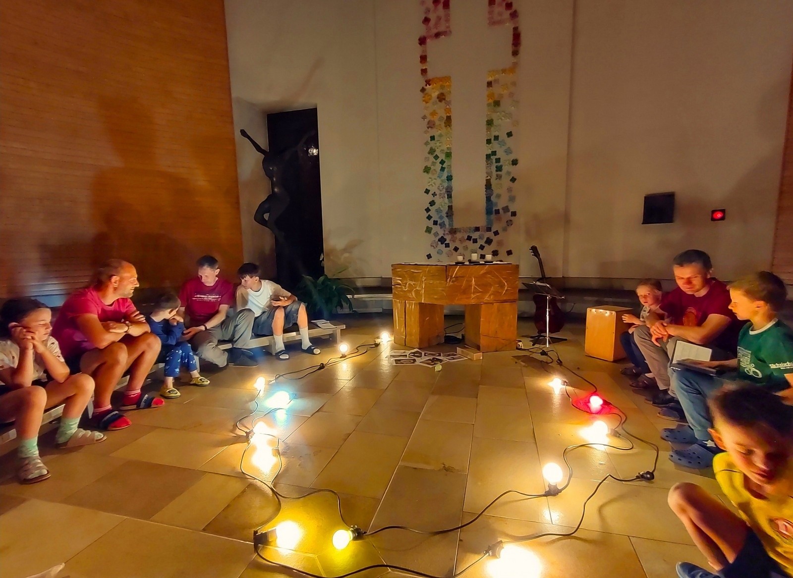 Abends wurde die sportliche Intention noch um Geschicklichkeit erweitert und ähnlich dem Format „Klein gegen Groß“ spielten alle in zwei Teams zwar gegeneinander um Punkte, aber auch miteinander, um Erfahrungen zu sammeln. Ein Mischformat aus Tischtennis, Kicker, Becherslalom und Geschicklichkeitsfahren durchs komplette Erdgeschoss brachte die Erfahrenen ins Schwitzen und Kinderaugen zum Leuchten. Dieses Leuchten wurde auch in den tagesabschließenden Impuls getragen, als alle eine eigene Glühlampe als Symbol für den ganz eigenen Lichtmoment des Tages zum Leuchten mitbrachten. Die Kapelle strahlte erhellt durch viele kleine Lieblingsmomente aufgereiht als Gemeinschaft-symbolisierende Lichterkette.