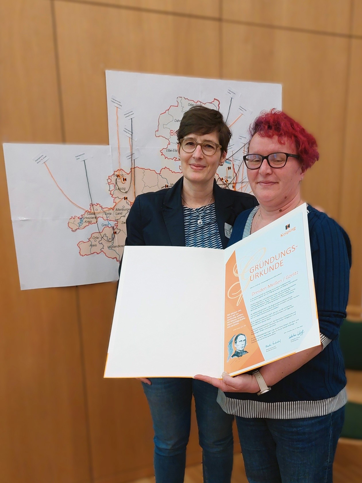 Nach einem zweijährigen Prozess, in dem viele Gespräche, Begegnungen, Wallfahrten und Beratungen stattfanden, ist damit ein wichtiger Schritt für die gemeinsame Zukunft erfolgt. Zugleich wurde ein neuer Diözesanvorstand gewählt, der nun seine Arbeit aufnimmt und den Verband gestalten wird. Zur Diözesanvorsitzenden wurde Maria Rädler (Kolpingsfamilie Cottbus) gewählt. Die Gründungsurkunde überreichte Bundessekretärin Alexandra Horster.