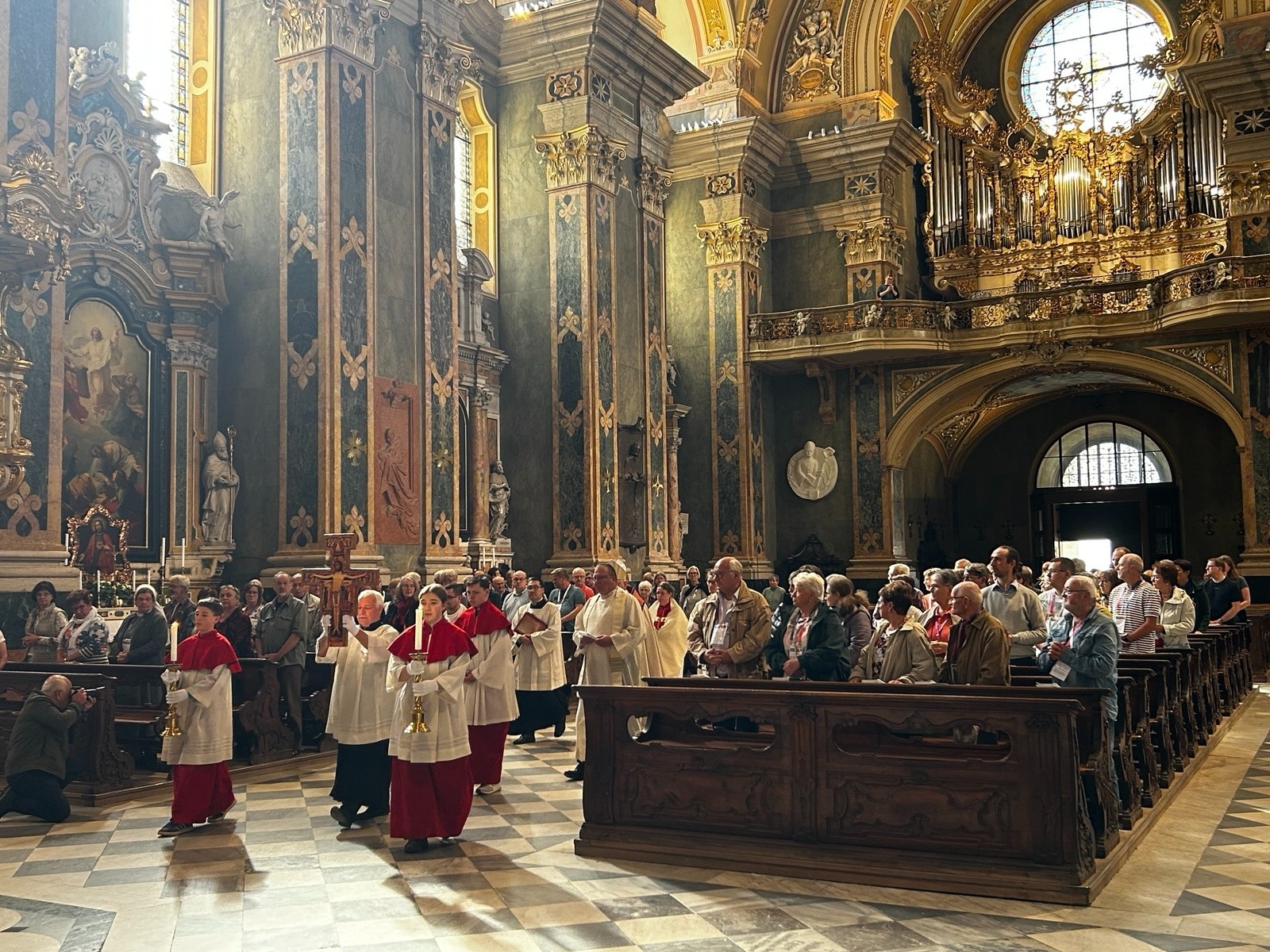 Bereits unterwegs wurde in den sechs Reisebussen mit einer kurzen Einführung und einem individuellen Reisesegen der gemeinsame Pilgerweg geistlich eröffnet. Das erste große gemeinsame Ziel war der Dom zu Brixen, wo sich am Nachmittag alle Pilgergruppen zur Eröffnungsandacht mit Bischof Heinrich versammeln sollten. In dieser feierlichen Andacht stand die Bitte um Gottes Begleitung für die bevorstehenden Tage im Mittelpunkt. Aufgrund zahlreicher langwieriger Verkehrsbehinderungen und Staus konnten leider jedoch nicht alle Busse an der Auftaktandacht teilnehmen. Sie verbanden sich geistlich, indem eigene Andachten unmittelbar unterwegs in den Bussen gefeiert wurden.