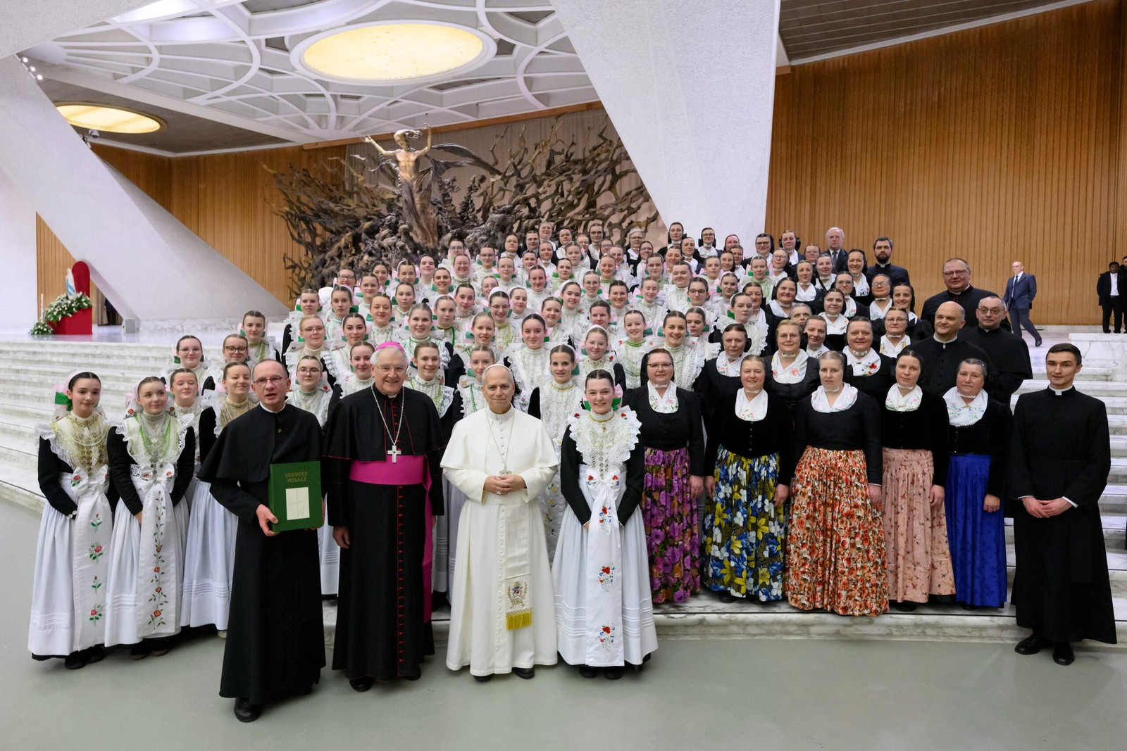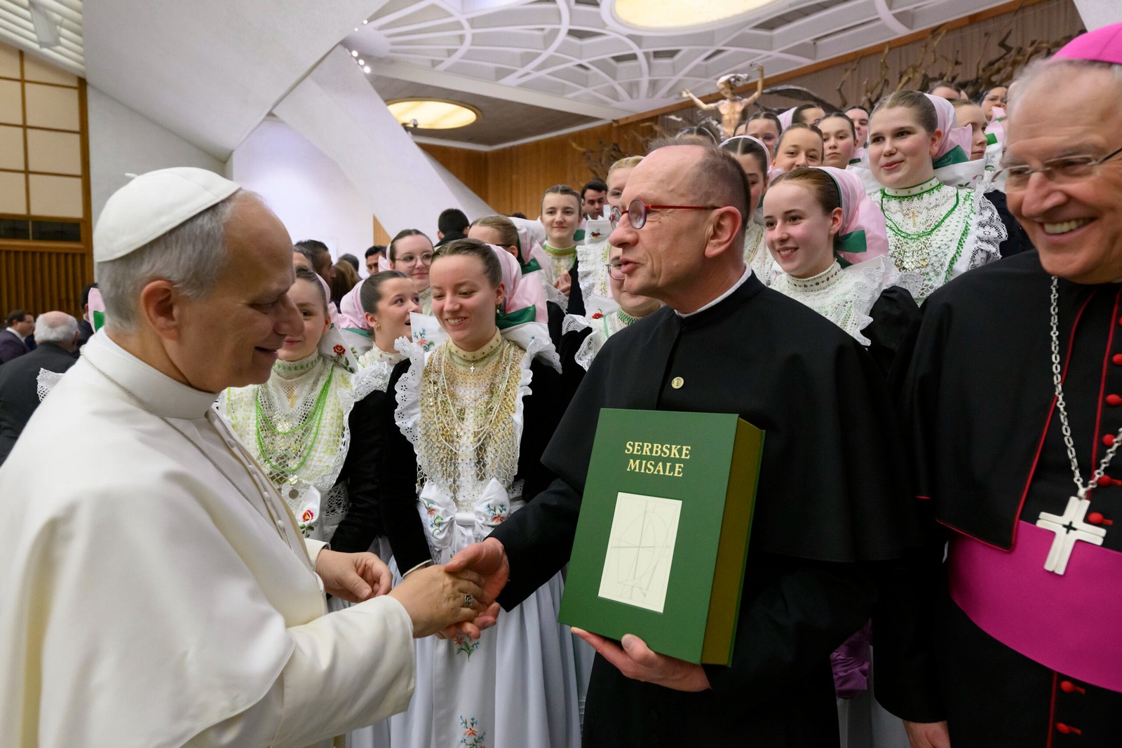 Rom. Gleich dreimal hatte Bischof Heinrich Timmerevers am Mittwoch, 11. Februar, die Gelegenheit zur persönlichen Begegnung mit Papst Leo XIV. im Vatikan – in einer Privataudienz, bei der Generalaudienz sowie bei einer Begegnung der Wallfahrtsgruppe sorbischer Druschki unseres Bistums Dresden-Meißen mit dem Heiligen Vater. Bischof Timmerevers begleitete die Wallfahrerinnen, die sich vom 8. bis 14. Februar auf den Weg in die Ewige Stadt gemacht hatten. Sechzig junge Sorbinnen im Alter ab 14 Jahren waren dabei gemeinsam mit vierzig Ankleidefrauen und mehreren Priestern unterwegs. Ziel der Pilgerreise war das Gebet an den Gräbern der Apostel Petrus und Paulus, die Vertiefung des Glaubens im Zentrum der Weltkirche sowie die Teilnahme an der Generalaudienz mit dem Heiligen Vater.