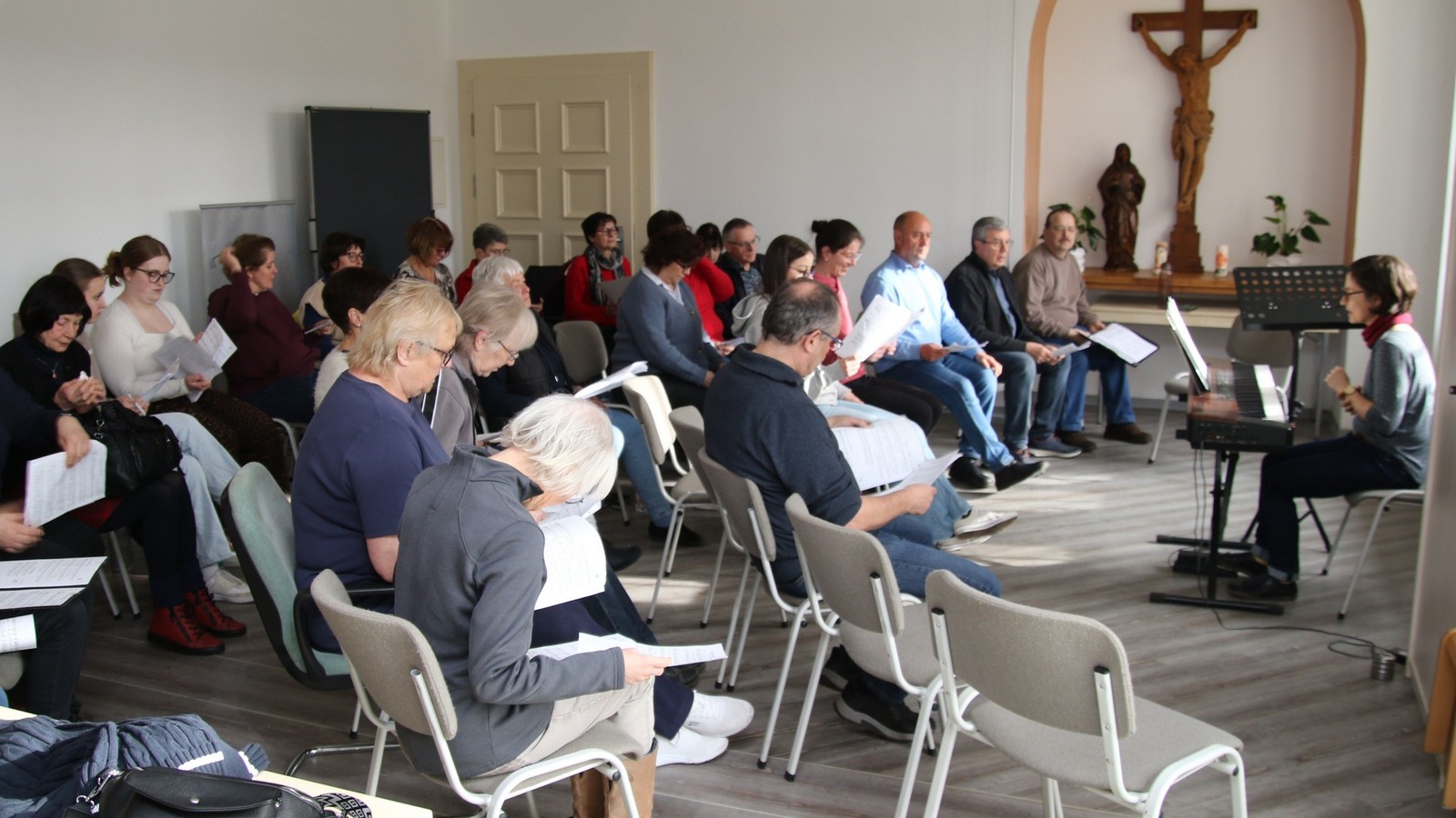 Auerbach. Am Palmsonntagswochenende, 27. bis 29. März 2026, haben sich 33 sangesfreudige Pfarreimitglieder zu einem Chorprojekt in der Pfarrei St. Christophorus Auerbach getroffen, das nunmehr bereits zum dritten Mal durchgeführt wurde. Etliche Teilnehmerinnen und Teilnehmer waren schon 2019 und 2022 dabei. Das Leitungsduo Claudia Fritsch und Dominic Sonntag hatte erneut eine Liederauswahl für einen stimmungsvollen Gottesdienst am Palmsonntag vorbereitet, die auf viel Begeisterung stieß.