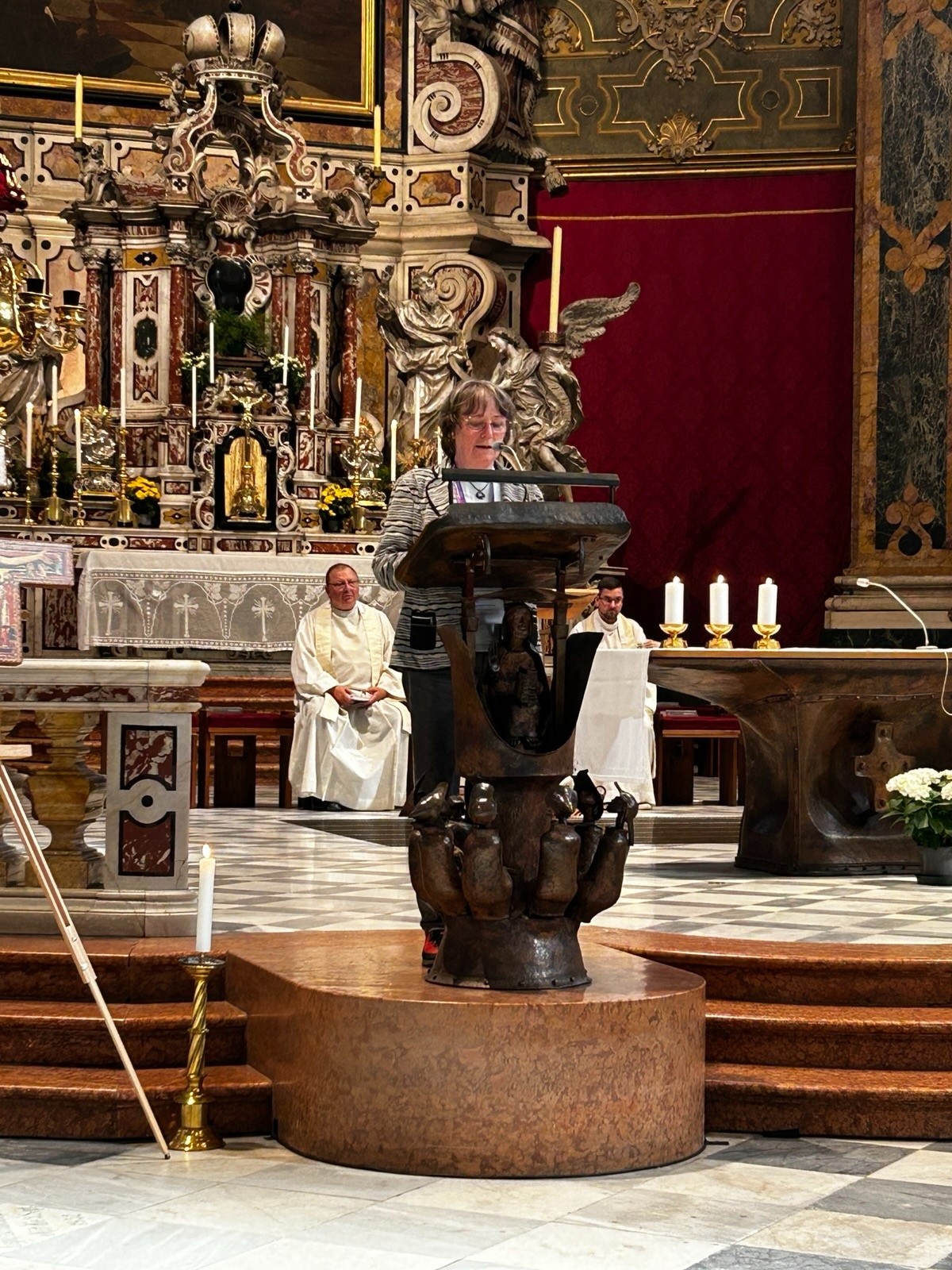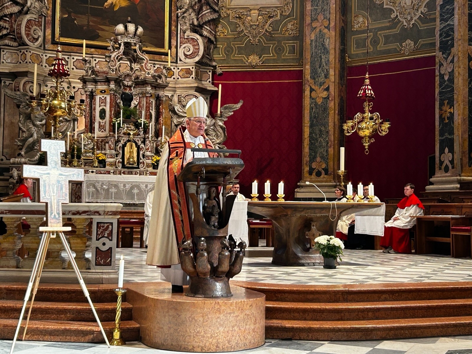 Bereits unterwegs wurde in den sechs Reisebussen mit einer kurzen Einführung und einem individuellen Reisesegen der gemeinsame Pilgerweg geistlich eröffnet. Das erste große gemeinsame Ziel war der Dom zu Brixen, wo sich am Nachmittag alle Pilgergruppen zur Eröffnungsandacht mit Bischof Heinrich versammeln sollten. In dieser feierlichen Andacht stand die Bitte um Gottes Begleitung für die bevorstehenden Tage im Mittelpunkt. Aufgrund zahlreicher langwieriger Verkehrsbehinderungen und Staus konnten leider jedoch nicht alle Busse an der Auftaktandacht teilnehmen. Sie verbanden sich geistlich, indem eigene Andachten unmittelbar unterwegs in den Bussen gefeiert wurden.