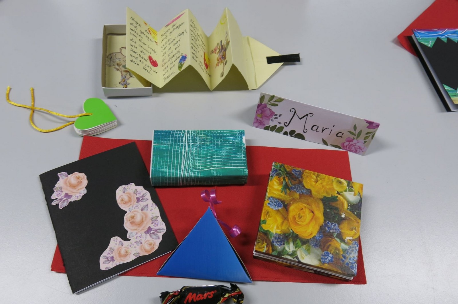 Die Idee und Ausführung dieses Wochenendes lag in den Händen der Buchbinderin und Grafikerin Angelika Pohler aus Leipzig. Sie steuerte nicht nur die Beispielbücher, sondern eine Menge vorbereitetes, geschnittenes Papier, Pappen, hochwertige Farbpapiere und die nötigen Arbeitsmaterialien wie Federn, Tusche, Schriftvorlagen, aber auch Falzbeine, Klebstoffe, Heftnadeln und Faden usw. bei.