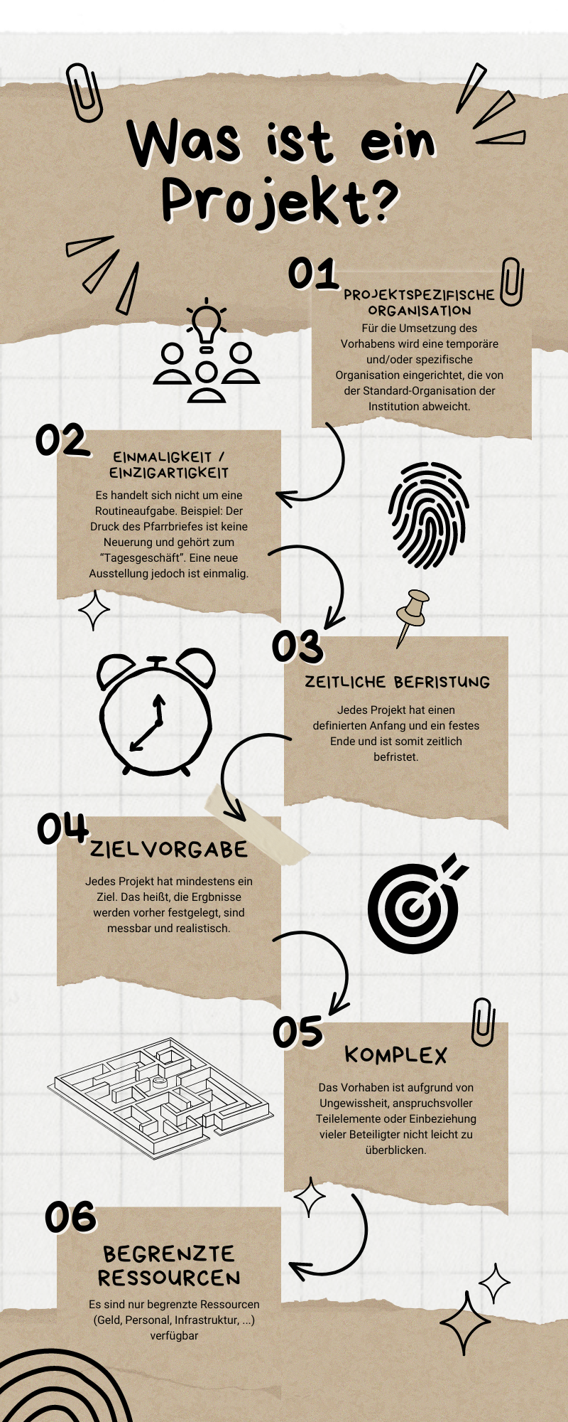 - Einmaligkeit / Einzigartigkeit: Es handelt sich nicht um eine Routineaufgabe. Beispiel: Der Druck des Pfarrbriefes ist keine Neuerung und gehört zum “Tagesgeschäft”. Eine neue Ausstellung jedoch ist einmalig.