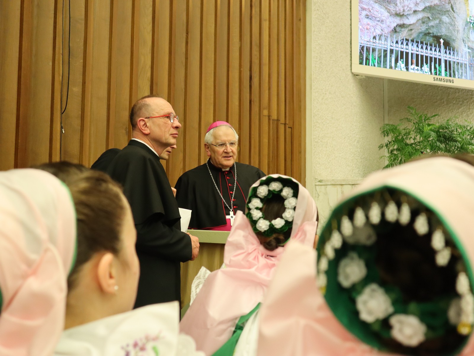 Pfarrer Měrćin Deleńk aus Crostwitz erläutert: "Die Wallfahrt stand unter den Anliegen tiefer Dankbarkeit gegenüber dem Heiligen Vater, der Treue zur Kirche sowie dem Wunsch, im Glauben weiter zu wachsen. Die Teilnehmerinnen kamen aus allen sorbischen Pfarreien und setzten damit ein sichtbares Zeichen lebendigen Glaubens und gelebter Tradition." Pfarrer Delenk überreichte dem Heiligen Vater ein Messbuch in sorbischer Sprache.