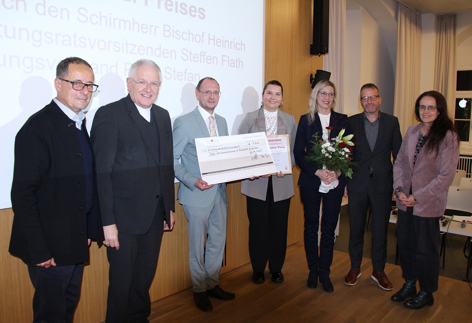 Den zweiten Preis erhielt das Projekt „Kaffee, Fellschnauzen und musikalische Reisen“ des Katholisches Seniorenzentrum St. Elisabeth Plauen, der ehrenamtliche soziale Dienst der Einrichtung, der das Zusammenleben und das Miteinander der Bewohnerinnen und Bewohner fördert. Den dritten Preis bekam das „Frauencafé“ in Freital, das zum Caritasverband für Dresden gehört und besonders Frauen mit Migrationshintergrund stärken will, indem es Räume für Austausch und Begegnung schafft. Der erste Preis ist mit 2.000, der zweite Preis mit 1.500 und der dritte Preis mit 1.000 Euro dotiert.